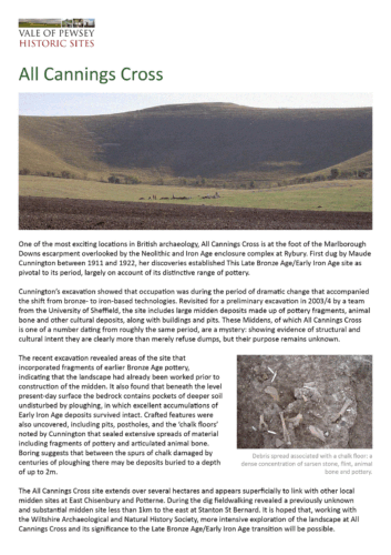 All Cannings Cross in the Vale of Pewsey in Wiltshire lies at the foot of the Marlborough Downs escarpment. It is overlooked by the Neolithic and Iron Age enclosure complex at Rybury.