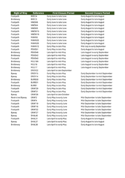 Whilst the work is being done, it is necessary to temporarily close public rights of way (roads, byways, bridleways and footpaths) that pass underneath the overhead lines in the areas they will be working.